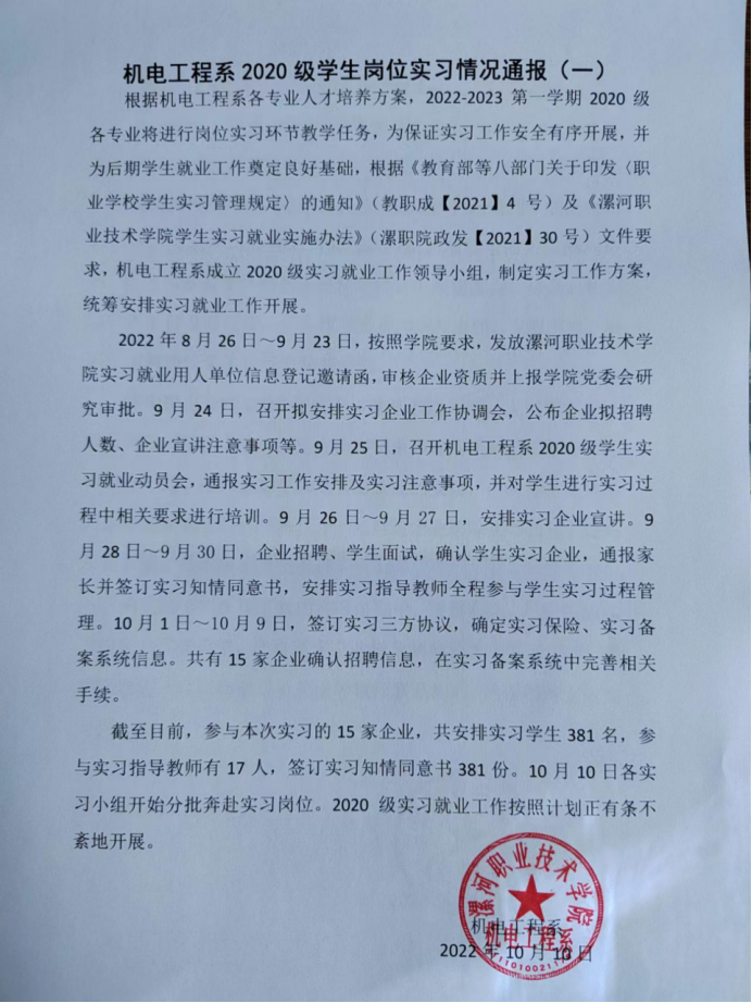 机电工程系2020级学生岗位实习情况通报(一)