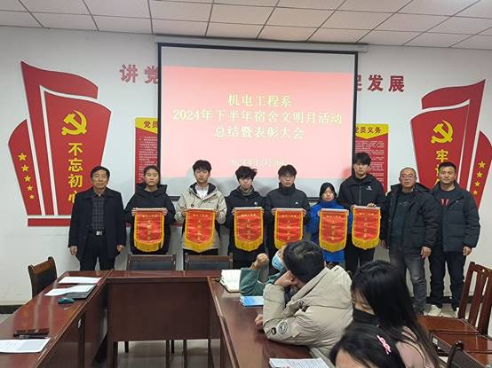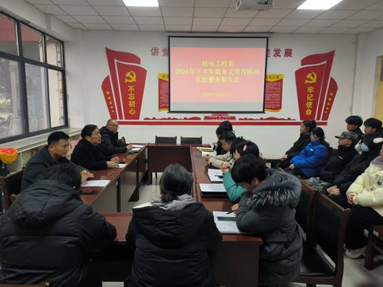 2024年12月30日下午,机电工程系在系会议室召开2024年下半年宿舍文明月活动总结暨表彰大会。系领导班子成员、辅导员及受表彰的先进集体和先进个人参加会议。会议由机电工程系李大川老师主持。