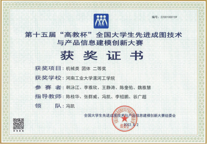 2022年漯河工学院代表队在全国大学生“先进成图技术与产品信息建模创新大赛”中荣获个人一等奖,团体二等奖。