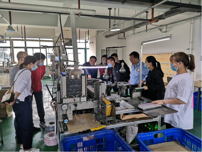 在企业总经理张轩的陪同下,冯凯一行参观了红黄蓝电子科技有限公司的研发中心和生产车间,对公司的生产设备、主要产品、研发方向有了整体了解;企业机械工程师刘工介绍了公司目前准备研发设备的基本要求和初步设想,张总介绍了公司的研发情况以及公司未来几年从生产型向研发型企业转变的规划愿景。