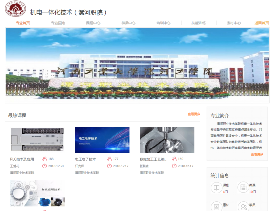 机电一体化技术专业教学资源库是我院2017年河南省“创新、行动、发展”计划中的建设项目,主要完成了该专业的专业调研报告、人才培养方案以及《电机应用技术》、《液压与气动技术》等6门专业核心课程的资源建设,建成后能实现线上线下混合式教学。项目建设团队由我院机电工程系、电气电子工程系相关专业教师共17人组成,经过近一年的建设,项目组成员完成了课程教学内容设计、知识树构建、脚本编写、视频录制修改、PPT制作、素材收集等,并于2018年11月申请了“智慧职教”专业教学资源库的使用权限,目前已上传课程素材1102条,4门课程已经发布,2门课程正在建设中,可供学生及企事业单位技术人员进行在线学习,课程刚刚发布,就已经吸引了325人选课学习。