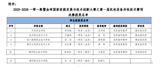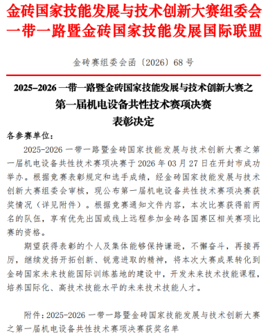 3月27日—30日,2025-2026一带一路暨金砖国家技能发展与技术创新大赛第一届机电设备共性技术决赛在开封职业学院隆重举行。来自全国多所院校80余支参赛队伍齐聚一堂,围绕机电设备共性技术展开激烈角逐。太阳成城集团tyc234cc智能控制技术专业的学生张家祥和吴岩参赛并获佳绩。